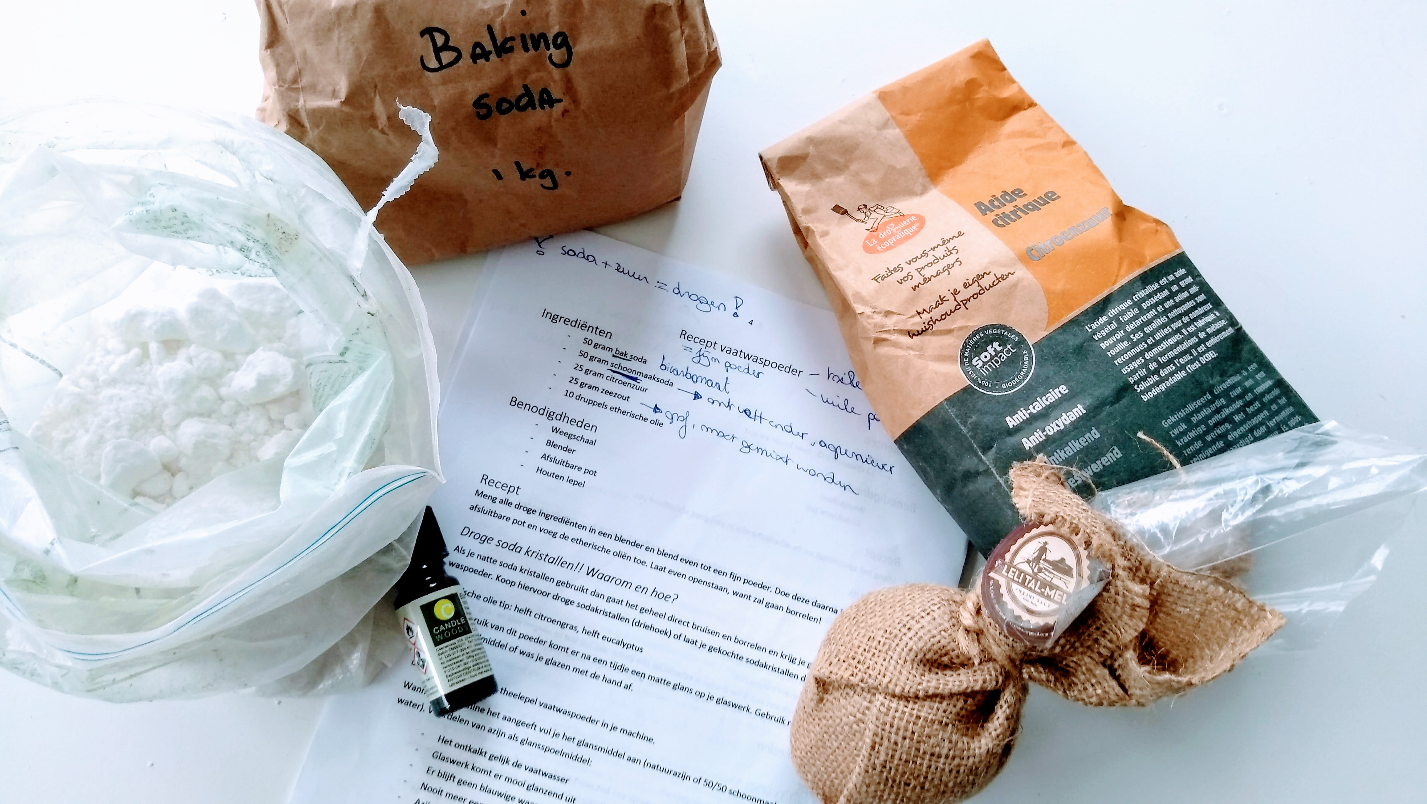 De droge ingrediënten, dat is dus eigenlijk alles behalve de etherische olie. Vaatwas-drugs maken, gemakkelijker kan niet toch?